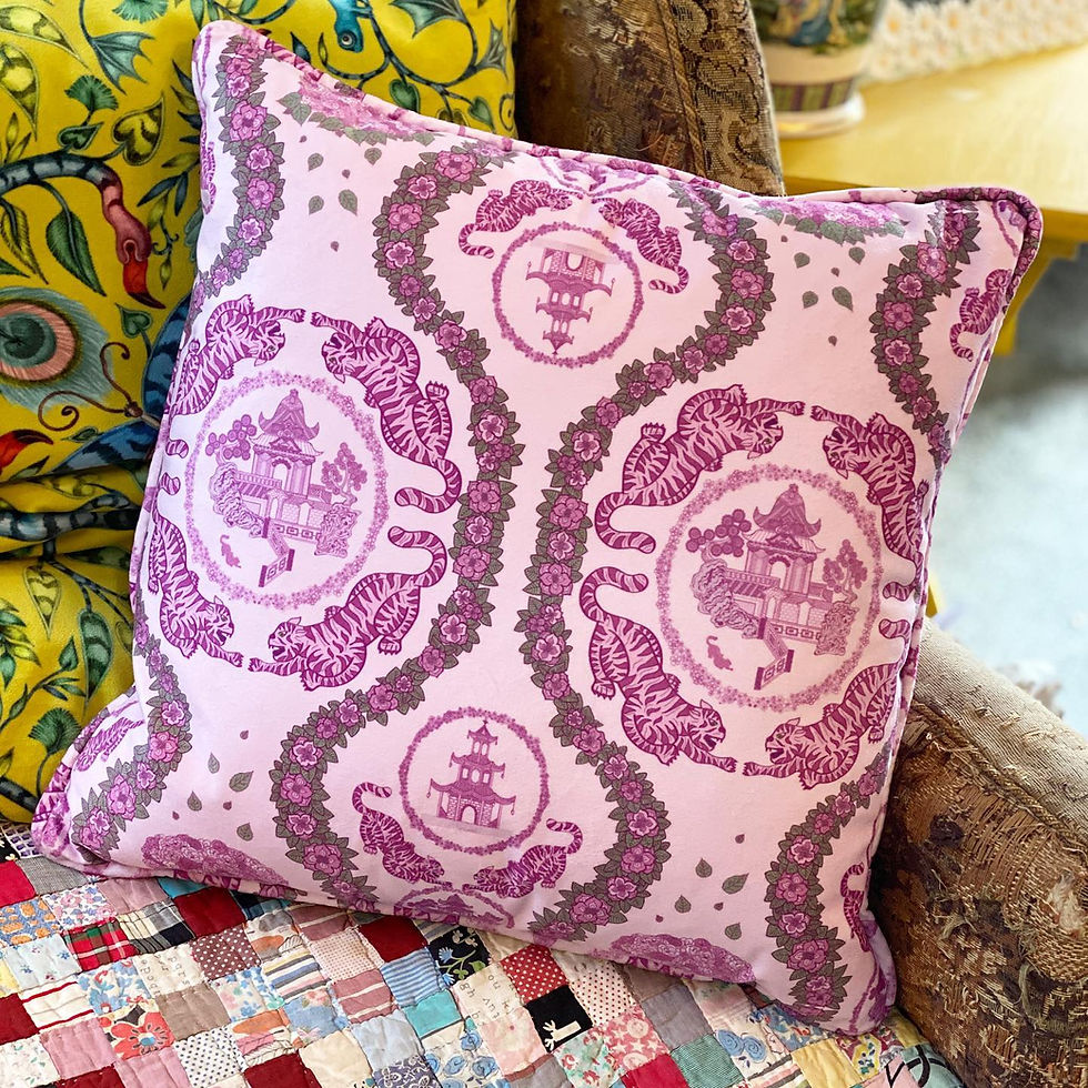 Pink Tiger Chinoiserie Print Velvet Fabric