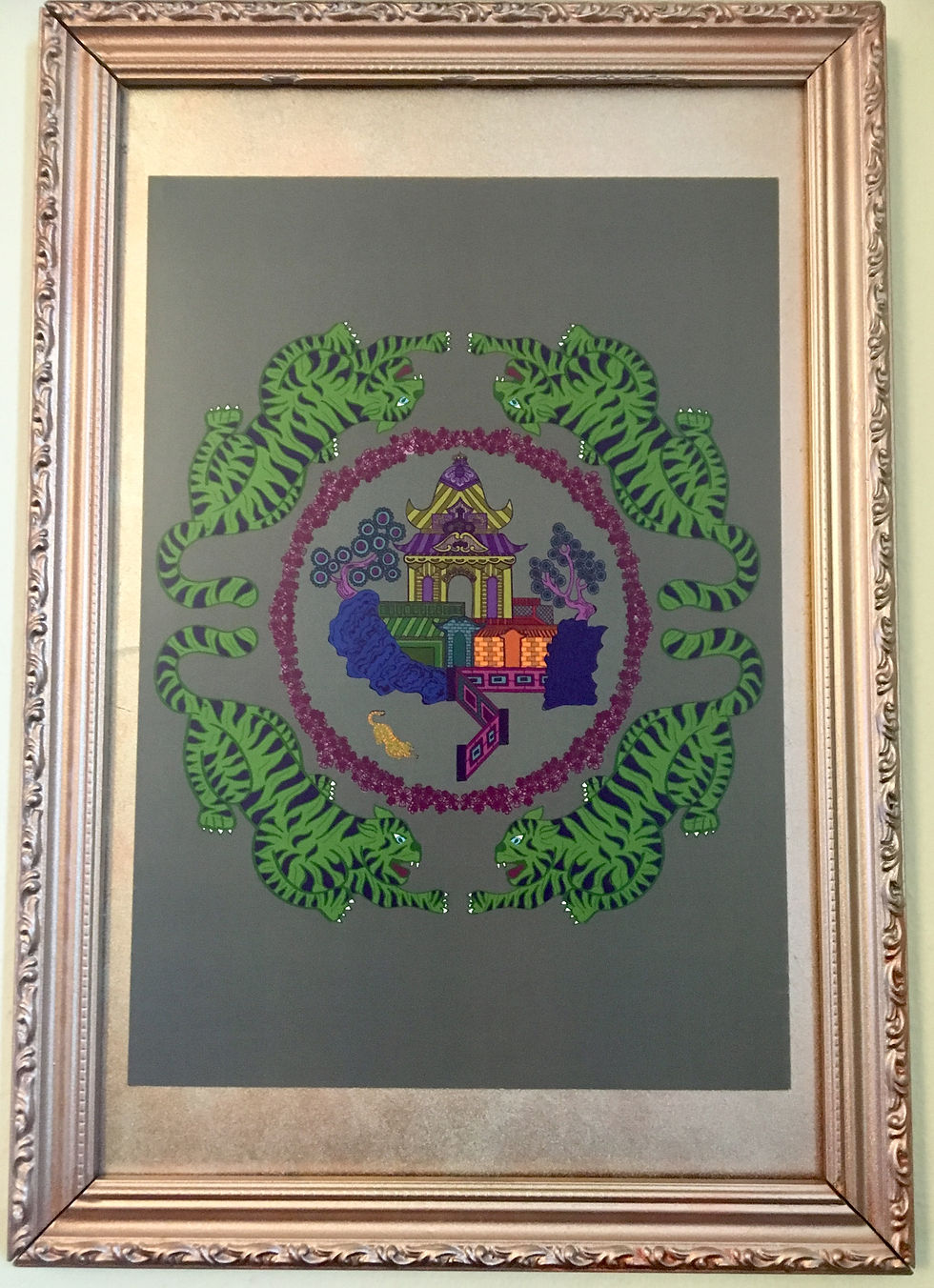 Tiger Chinoiserie Blue Velvet Crown Shade with Blue Fringe and Braid